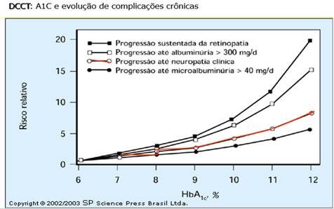 O gráfico relaciona os níveis de HbA1C e incidência de complicações crônicas, divulgadas após o trabalho do DCCT – The Diabetes Control and Complications Trial (1993)